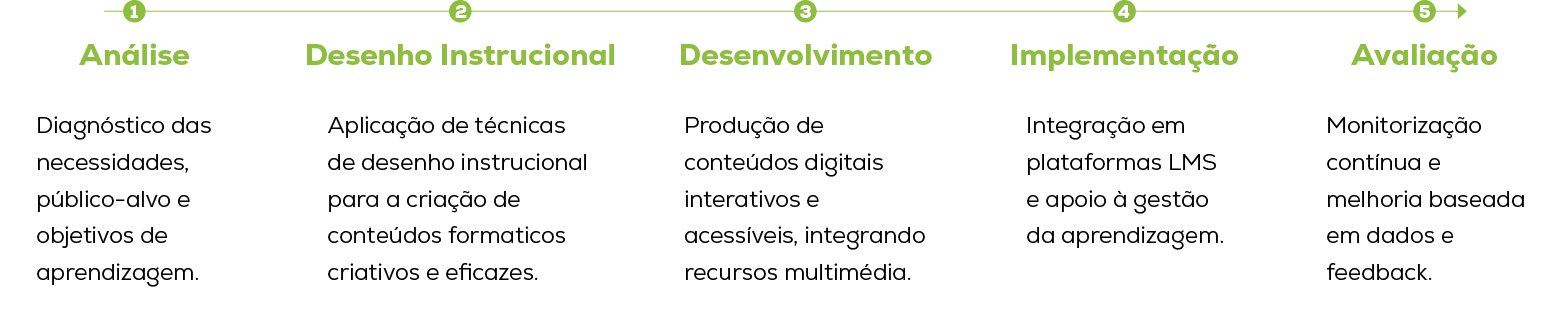 A nossa abordagem baseia-se na metodologia ADDIE que garante rigor, consistência e foco nos resultados:
